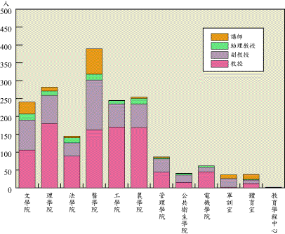 專任教授及副教授所佔比重逐年提昇,迄1998年達86.2%,逾五分之四。按學院 分,依序為工學院96%、電機學院94%、管理學院93%、農學院92%、理學院92%、 公共衛生學院88%、法學院87%、文學院79%、醫學院78%(圖4;表3)。 圖4. 各學院專任教師人數統計圖,1998